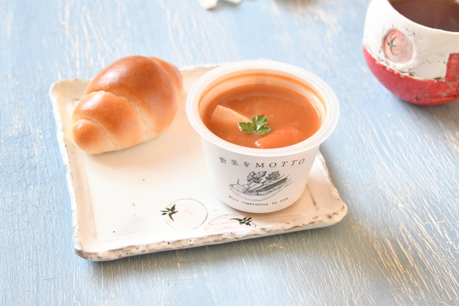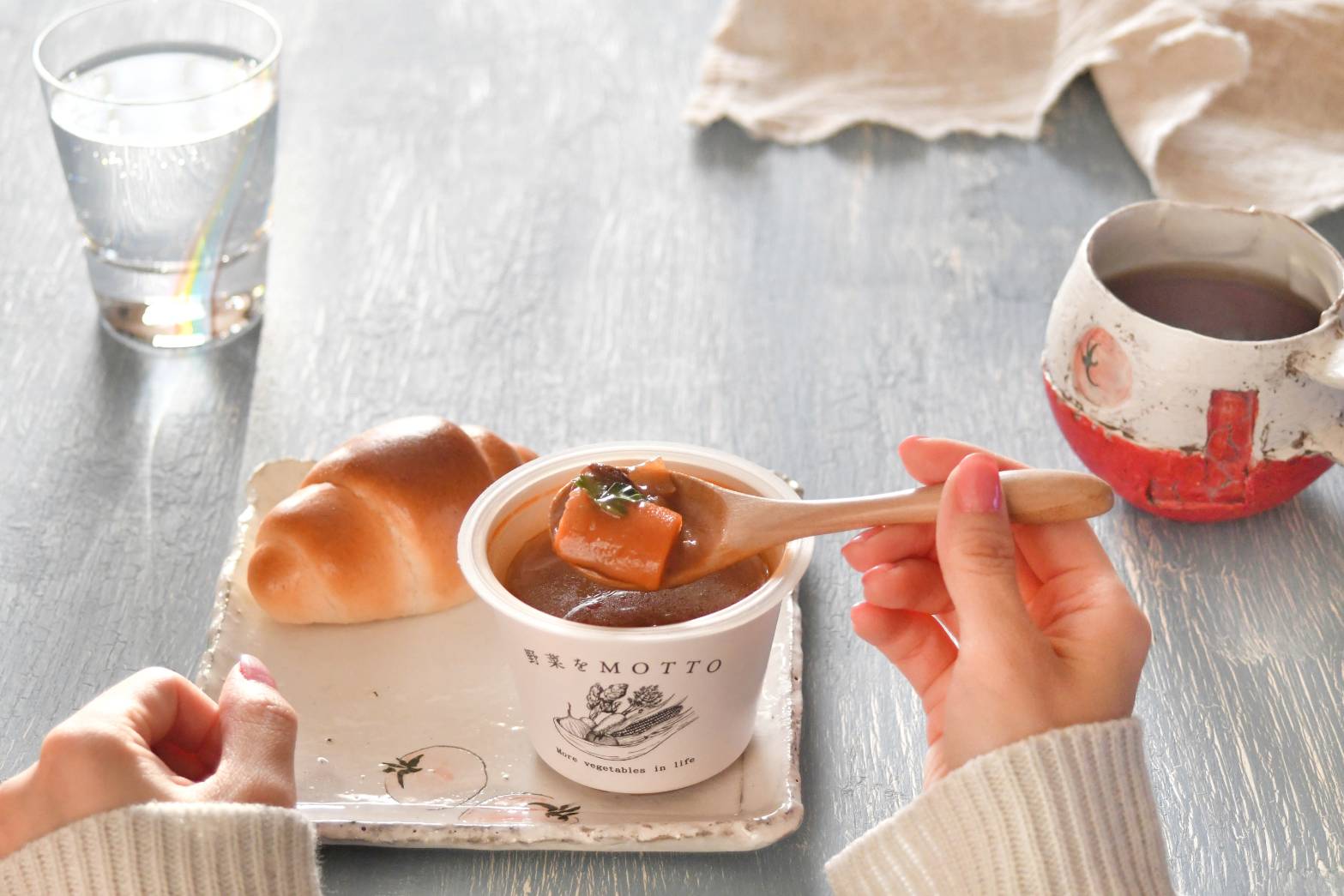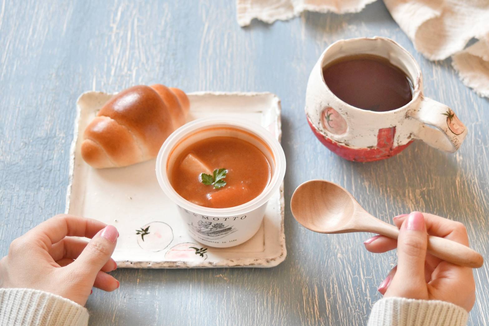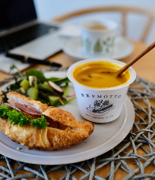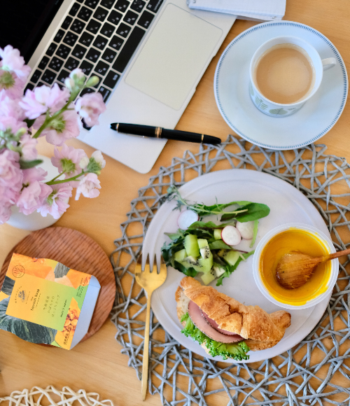 おうちでの仕事がちょっと忙しい時でもぱぱっと用意できるスープを合わせれば、簡単なパンと野菜を用意するだけでカフェごはん風ランチに!