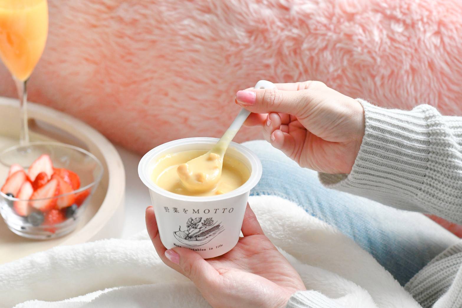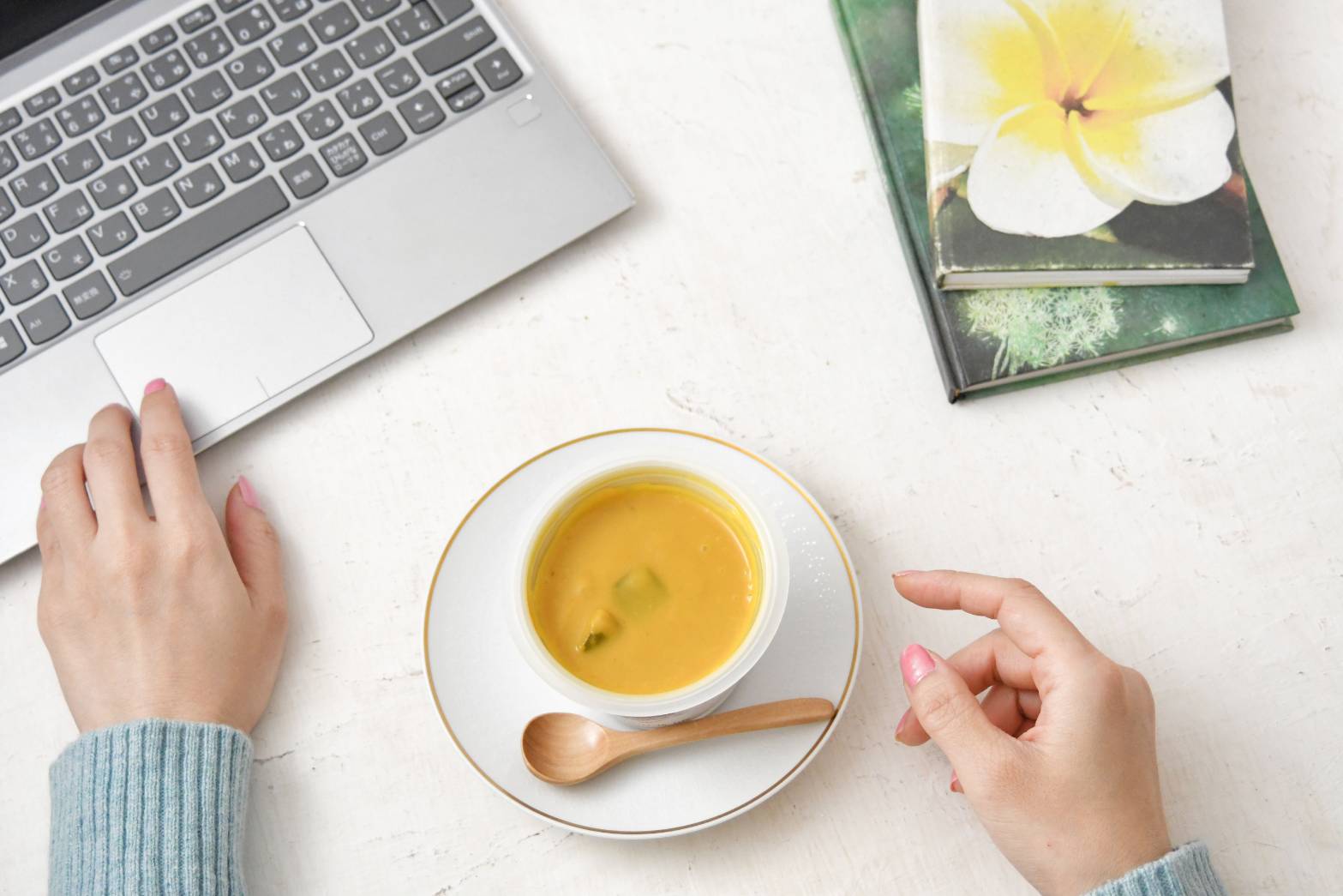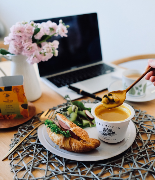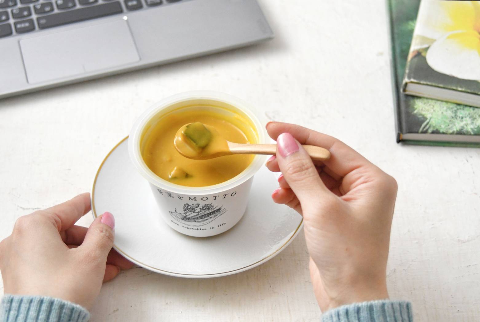 おうちでの仕事がちょっと忙しい時でもぱぱっと用意できるスープを合わせれば、簡単なパンと野菜を用意するだけでカフェごはん風ランチに!