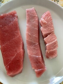 赤身:さっぱりながらも甘さがあり、飽きないお味。1日目はお刺身で、2日目はたれで漬けて丼にしていただきました。お刺身もよかったけど、マグロの漬け丼が好評でした。