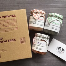 佐賀県玄界灘を望む仮屋湾で育った真鯛を使用し、鯛の味わいを贅沢に引き出した「鯛のご飯のお供」です。真鯛を切り身にし、専用だし汁にじっくり丁寧に漬け込み、博多名物の明太子と和えた「鯛めんたい」。茶漬け専用だし汁に鯛を漬け込み下味を付けた「鯛のお茶漬け」。タラの内臓を使用することで独特な味わい引き出した「鯛チャンジャ」の3種セット。スタイリッシュなボックスに入って届くので、贈り物にもおすすめです。