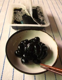 フタを開けると中の黒豆は黒ぐろと輝き、表面がツヤツヤしていて、まるで宝石のようにも見えました。何粒かは皮が破れており、購入する黒豆では珍しいなとも感じました。