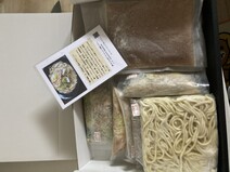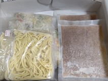 中身を確認し、写真を撮った後すぐに、カチカチに凍った麺、スープ、具材は、冷凍庫に入れました。