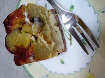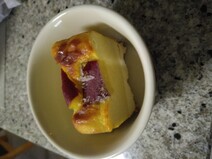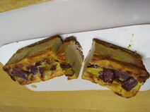 2層になったケーキで上層は紅いものスイートポテト、下層はチーズケーキです。スイートポテト層の方が厚く、2対1くらいです。スイートポテトの層は滑らかな中にお芋のほくほく感が感じられて良いですね。角切りのお芋は特に加工はされていないようで自然のままのお芋が味わえます。大学芋のように蜜をかけたり甘さを加えたりされていないお芋本来の優しい甘さが良いです。柔らかい蜜が溢れるお芋ではなく、紅はるかならではのほっくり食感やお芋らしい風味を楽しめて、とても美味しいです。