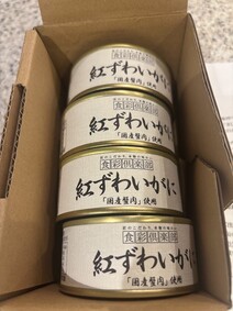 段ボールに紅ずわいがにの水煮の缶詰が4缶入ってました。