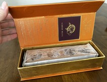 今ままでスイーツの箱として見た事の無いくらいキラキラで素敵な箱!磁石付きの蓋で宝物のように大切に梱包されたケーキが届きました。