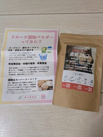 「フルーツ酒粕パウダー」からはふわっとりんごのいい匂いがします。舐めるとすぐに溶けて、おおっ!感動!ほんのり甘みもあるような・・。