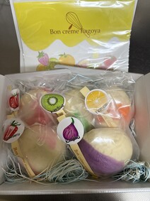 地産地消にこだわり、愛知県産のフルーツやトマトのコンポートを、名古屋コーチンの濃厚なカスタードクリームで包み込んだ「フルーツカスタードまん」です。生地には、絹のような白さともっちりとした食感が特長の愛知県産小麦「きぬあかり」を使用。冷たくても温かくても楽しめます。カスタードクリームには、名古屋コーチンの卵黄のみを贅沢に使用し、愛知県産の「どうまい牛乳」と合わせることで、濃厚でコクのある味わいに仕上げています。愛知県産の「イチゴ」「みかん」「キウイ」「いちじく」「MIUトマト」のジャムやコンポートが包まれています。専用ボックスに入って届くので、贈り物にもおすすめです。