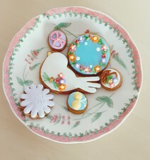 たくさんの可愛らしい小花をあしらったリースのアイシングクッキーと小とりのアイシングクッキー。それと可愛いくるみボタンのような小粒のアイシングクッキーたち。まるで絵本の表紙のようです。リースのお花の花びらや葉っぱの一つ一つがすごく丁寧でぷっくりとしていてめっちゃ可愛い。ずーっと見てられる可愛さで感激しました。