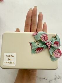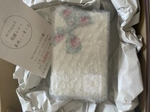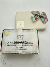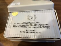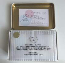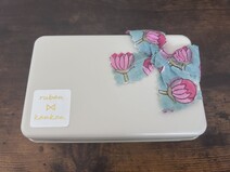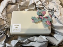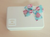思いのほか小さな箱。開けてみると、なんということでしょう!とっても可愛らしいサイズのクッキー缶がありました。お花の柄のリボンが飾られていてなんだかほっこり。