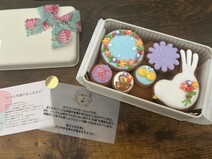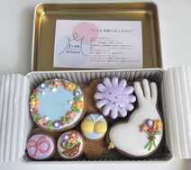 リボン付きの缶に詰められた「クッキー缶」です。小花をあしらったリースと小鳥のアイシングが印象的なセットで、米粉と麹をたっぷり使ったオリジナルレシピのグルテンフリーな発酵クッキーです。かわいいだけでなく素材にもこだわり、甘さ控えめで小麦粉、バター、卵、砂糖不使用(アイシング部分には白砂糖・少量の卵白を使用)です。自家製酒種酵母を使用し、2日間熟成させた米粉の生地で作っています。かわいさがぎゅっと詰まったクッキー缶なので、自宅用だけでなく贈り物にもおすすめです。