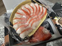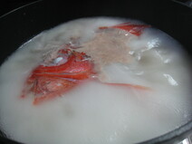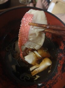 真空パックで届いたのはしゃぶしゃぶの金目鯛の切り身とお出汁用のあら、出汁のセットでしたが、鯛が赤く光り輝いていて開封するなりワクワクした気持ちに。これは贈答品としてもぴったりだと思います。
