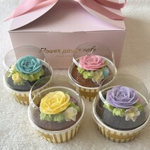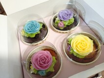 まるで生花のような透明感。開けた瞬間、花のような笑顔咲く、4色の薔薇の「食べられるお花のカップケーキ」。カップケーキ専用にデザインしたブロッサムピンクの箱は、かわいい“リボン”でそっと結んであります。リボンを解き…お気に入りの紅茶で特別なティータイムをお楽しみください。薔薇は一枚一枚、心を込めて丁寧に絞らせていただきます。