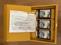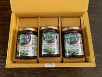 黄色の箱もしっかりとして、瓶物も安心です。中には素敵なソースが3つも入っていて、貰った方は嬉しい気持ちになります。
