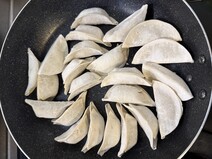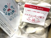 厳選した海塩を使用した「餃子」です。皮の厚みは0.8mm以下で口溶けが良く食べやすく、焼き目はサクッと仕上がり、国産小麦粉本来の味と香りが楽しめます。具には京都ブランドの豚肉を使用し、塩で食材の旨みや甘みを引き出しています。豚肉と野菜類のバランスが良いので、旨み・甘み・香りの余韻が心地よく、タレなしでそのままで食べるのがおすすめ。焼きたてから少し冷めたときまで、温度によって変化する味わいも楽しめます。エコパッケージ入りなので、自宅用におすすめです。