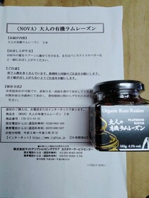 芳醇なラム酒に漬け込まれた「レーズン」です。カリフォルニアの契約農家で育てられた有機レーズンと有機黒糖を原料にした特製ラム酒で仕上げています。この商品のためにラム酒を造る蒸溜機までもNOVA社で製造しています。そうして出来上がったラム酒の奥行きある味わいがレーズンの甘さを包み込んだ大人だけが楽しめる贅沢なデザートです。そのまま食べるのはもちろん、アイスクリームやヨーグルト、カナッペのトッピングなど幅広く活用できます。