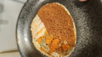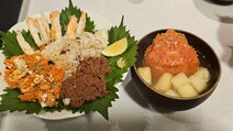 酢飯の上に紫蘇をのせ、その上に部位ごとにカニの身をのせ、商品についているだし醤油をかけて終了。