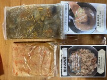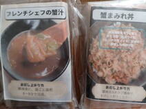 フレンチレストランが作った「蟹丼の具」と「蟹汁」です。「蟹丼の具」は、北海道産の生ずわい蟹、勢子蟹の内子・外子・蟹味噌・紅ずわい蟹を和えて調味しています。冷凍で届くので、流水1分で解凍し、ご飯に乗せるだけで本格的な「蟹丼」が完成します。蟹をたっぷり使い、野菜の味噌汁に仕上げた「蟹汁」は、フレンチの技法を用いて作った上品な味わいです。蟹汁とミルポワ(香味野菜)をじっくり炒め、白ワイン・ブランデー・フュメドポワッソン(魚の出汁)を加えて煮込んでいるので、蟹の旨味・香り・味わいを十分に堪能できます。ギフトボックス入りなので贈り物にもおすすめです。