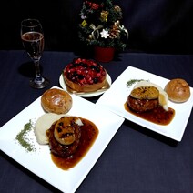 中でも本商品は、芳醇なトリュフソースとフォアグラを添えたロッシーニ風ハンバーグ、そして華やかな赤い果実のドームタルトをセットにした贅沢な一品です。