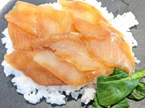 島根県浜田市で愛される「バトウ(マトウダイ)」を使用した「天然マトウダイ漬け丼」です。他県ではなかなか出会えない希少な白身魚「バトウ」のしっとりとした身と上品な脂の旨みを堪能できます。地元・浜田の醤油を使用したタレを使っています。まずは、そのままで、もっちりとした弾力を楽しみ、次にバトウの骨から丁寧に引いた「出汁」を注いで「出汁茶漬け」にするのがおすすめです。冷凍で届くので、流水解凍するだけで店の味が自宅で楽しめます。