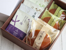 一枚一枚丁寧に焼き上げたふわふわしっとり食感の皮で包んだ「小倉あん・抹茶あんどら焼」と、日本茶5種の詰合わせです。湯気とともに広がる豊かな香りのお茶と、やさしい甘さのどら焼きがセットになっています。「どら焼き」は、王道だからこそ素材の味を堪能できる「小豆どら焼き」と、濃い抹茶の色合いと香りが楽しめる「抹茶あんどら焼き」の2種です。合わせる日本茶は、自然の恵みをいっぱいに受けて摘み採られた一番茶「深蒸し煎茶 きみくらの庵」、キレのある爽やかな味わいと香ばしい香りが特長の「ほうじ茶」、国産茶葉をじっくり発酵させた「和紅茶」など5種です。お茶のうまみ・あまみ・香りを最大限に引き出すピラミッド型ティーバッグタイプです。上品なパッケージ入りなので贈り物にもおすすめです。