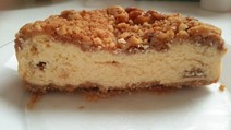 国産林檎たっぷり使用した「チーズケーキ」です。たっぷり使用した国産リンゴの程よい甘さの果肉が、濃厚でなめらかな生地のアクセントになっています。ケーキの上には、クルミとシナモンを入れたクランブルをトッピングしているので、香ばしく、ザクザクとした食感の違いを楽しめます。