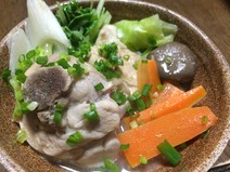 醤油と塩で味付けし、キノコ類、水菜、鶏つくね(セットのつくねはお鍋で全部食べたので、鶏ミンチに玉ねぎと片栗粉を入れて自作しました)を入れて作りました。