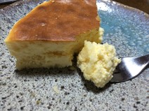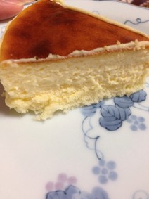 お皿にひと切れうつして切り口を見ると、上から焼き色の付いた薄皮、フワフワチーズ生地、なめらかチーズ生地、スポンジ生地の様な順に見えます☆
