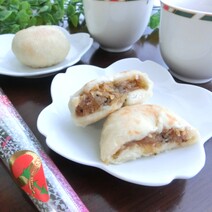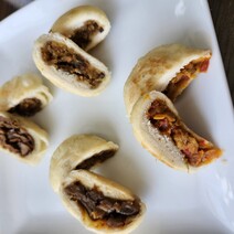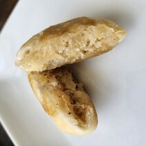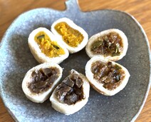 信州の郷土食「おやき」、作り方はそのまま、食べやすいふた口サイズにしました。小さくても具材たっぷり!