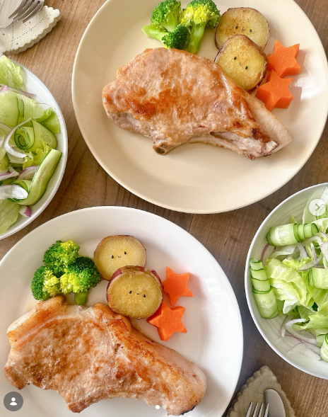 銘柄豚 館ヶ森高原豚の一番旨みのある骨の近くの希少なロース肉を贅沢に厚切り。ほんのりピンク色で十分火が通ってるから焼き過ぎないのがポイント。おいしい焼き方のレシピ付き。