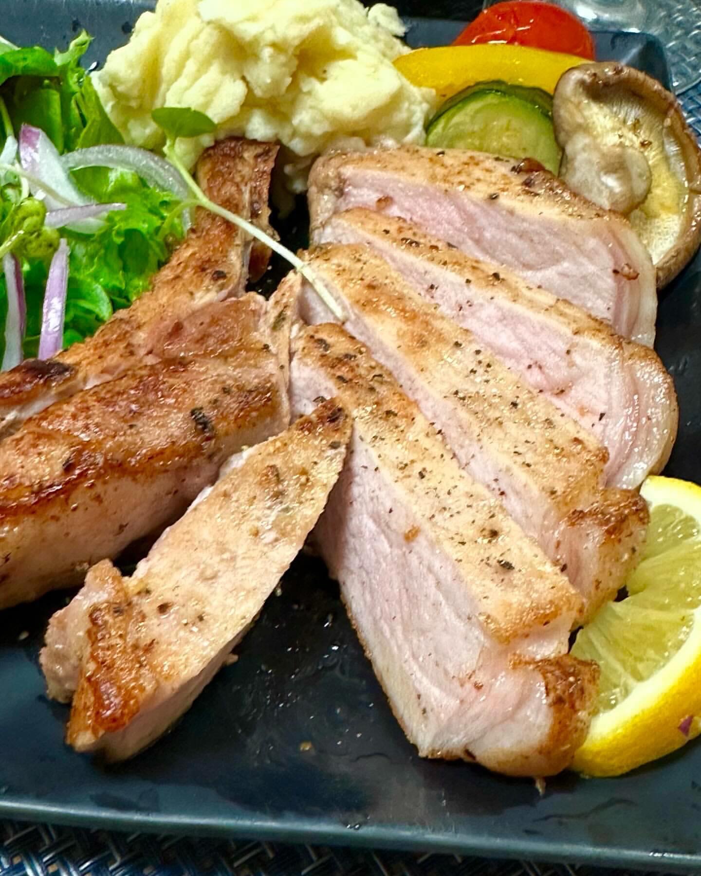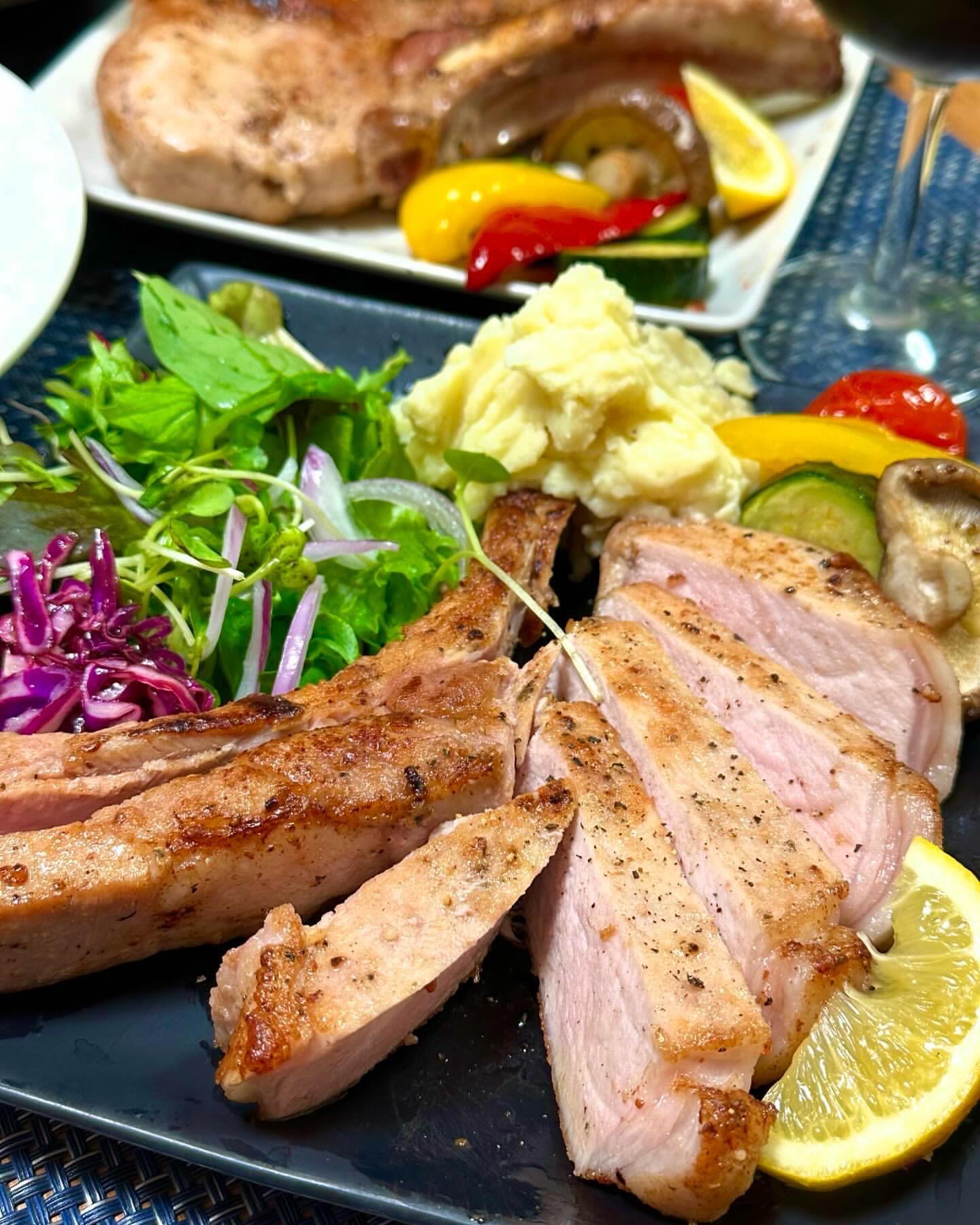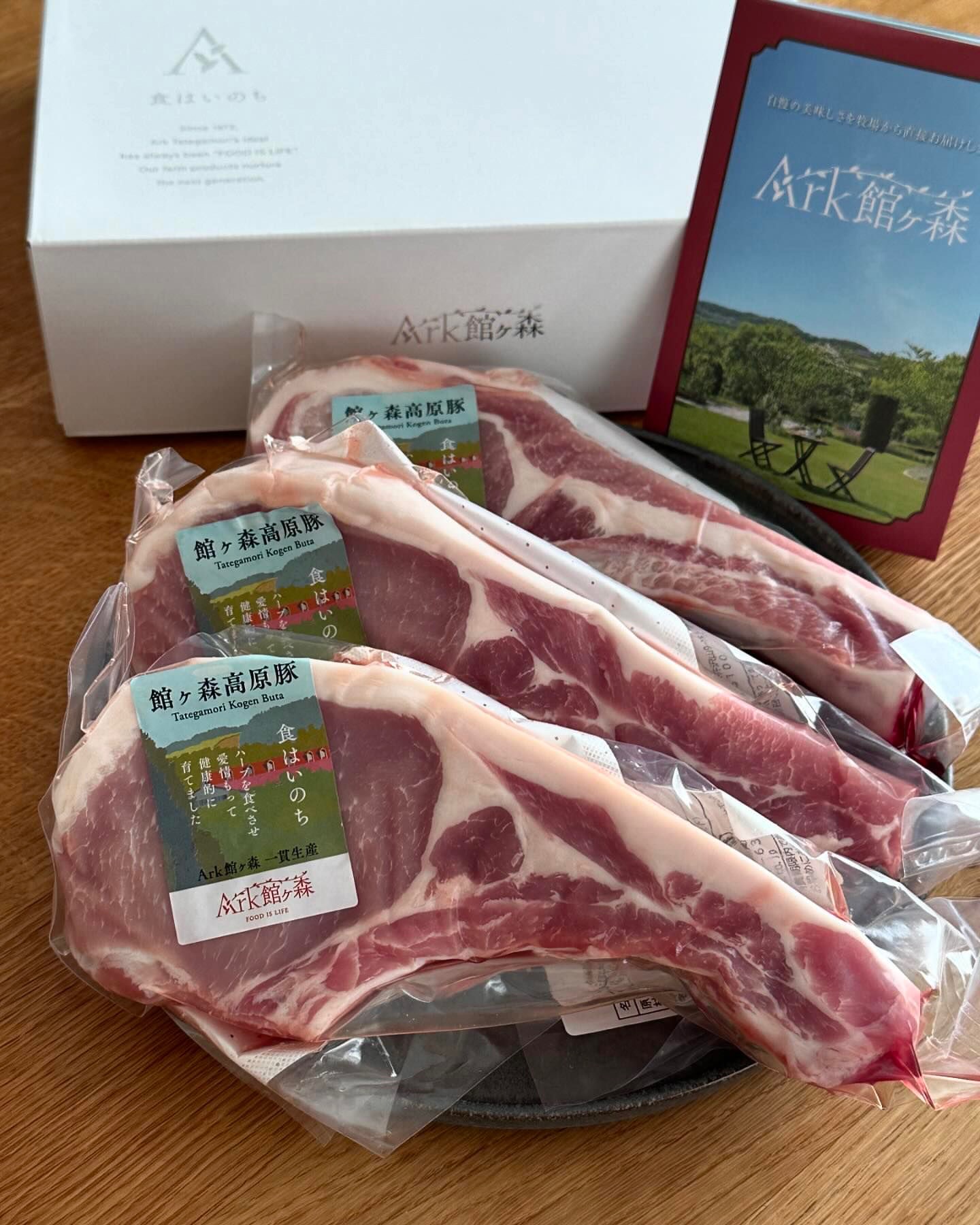 銘柄豚 館ヶ森高原豚の一番旨みのある骨の近くの希少なロース肉を贅沢に厚切り。ほんのりピンク色で十分火が通ってるから焼き過ぎないのがポイント。おいしい焼き方のレシピ付き。