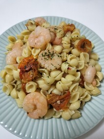 コンキリエ・ピッコレとは、貝の形をした極小パスタです。小海老もたっぷり15尾使用しました。アルデンテに茹で上げたコンキリエ・ピッコレにプリプリの小海老と、まるごと旨み成分のセミドライトマトを加え、アンチョビとガーリックの効いたソースで絡めました。厳選されたEXヴァージンオリーブオイルの上品な香りも是非ご堪能ください。