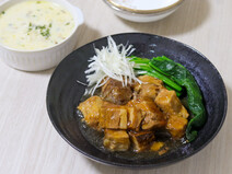 厳選された豚肉を原料に、丁寧に灰汁を取りながら手間をかけてゆでこぼし、長時間じっくりと炊き上げた脂身はヘルシーです。上品な薄味に仕上げておりますが、肉の臭みはまったくなく、口当たりの良い柔らかな肉は、さすが日本料理の総料理長が手作りで仕込んだと納得の、舌にとろける味わいです。ぜひご堪能くださいませ。
