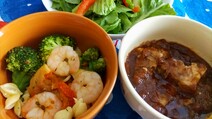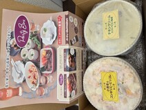 【小海老とコンキリエ・ピッコレ】容器を開けるとプリプリとしたエビが乗っていました。みんなで分けるにはエビが少ないかもと思っていたら容器の中にもエビがたくさん入っていてびっくりしました。ガーリックが効いていて美味しかったです。