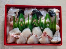 とらふぐ切り身・アラにふぐ皮とヒレ、特製ぽん酢や薬味セット、だし昆布をセットにしてお届けします。