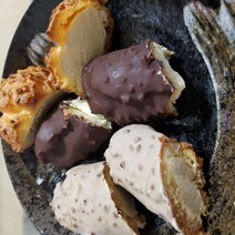 モカ味のエクレアです。見た目はカフェ・オ・レのような色味ですが、味も香りもコーヒーのいいところが感じられて、想像以上の美味しさです!!苦味はないのでコーヒーが苦手な方、お子様も楽しめます♪