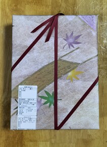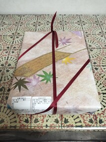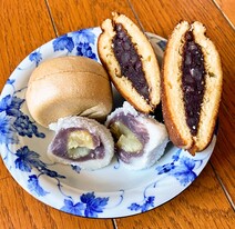 華やかな包みの中にかわいく絞られたお菓子、粒あんで栗とお餅がつつまれた、ちょっと豪華な和菓子です。これまた、外側の小豆がしっかり大粒で存在感がかなり大きいものです。周りの小豆の量がかなり多めですが、それでも甘さ控えめで、上品な甘さでした。栗は大きなのが丸ごと1個入っていて贅沢なお菓子です。