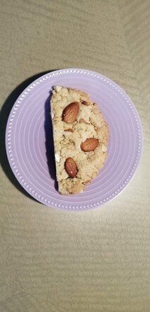 英字プリントの中身が見える個包装で、ビスコッティのようなゴツゴツとした表面に姿丸ごとのアーモンドが3粒均等に飾られており、半円状のフォルムもかわいらしいです。手に取ると想像よりもずっしりと重みがあり、食べ応えもありそう♪