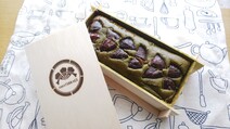 箱を開けると、優しい甘い香りとお店のロゴが焼き印された蓋が乗った木枠入りのケーキ。濃い抹茶色の生地に艶々の栗の渋皮煮が乗っていて秋らしさを感じますね。