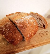 ライ麦の香り漂う食事系パンです。発酵種を掛け合わせたオリジナルの発酵種を使用。長時間発酵することで、焼き皮が香ばしく、何もつけなくても飽きのこないシンプルな味わい。料理の味をひきたてるパンです。煮込み料理に合わせるのがおすすめ。歯ごたえのある皮部分と、空気を含んだ軽い食感の内側部分とのコントラストが楽しい商品です。