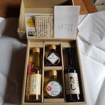 明治13年(1880年)創業。今では1%しかないと言われる杉桶で2年から3年熟成発酵させた醤油を登録文化財の蔵で製造しています。杉桶づくりをする醤油屋では、最古の醤油屋です。その金両の中で一番人気のだし醤油とガーリックオイルを中心に、人気商品を詰め合わせました。だし醤油は、なんでも美味しくしてしまう別名【魔法の醤油】です。ガーリックオイルは、香川のニンニクをオリーブオイルでコトコト煮込みました。食べても臭くならないのが人気。その人気者同士をブレンドした小豆島ドレッシングはサラダに、ガーリックオイルにハーブソルトを混ぜたソルティガーリックオイルは、食パンにつけると最高です。