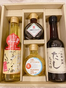明治13年(1880年)創業の老舗 醤油屋が作った「調味料セット」です。「だし醤油」は、なんでも美味しくしてしまう別名「魔法の醤油」といわれる逸品。杉桶で2年から3年熟成発酵させた希少な醤油だからこそ出せる味です。「ガーリックオイル」は、香川のニンニクをオリーブオイルでコトコト煮込みました。後味が柔らかいのが特徴。「だし醤油」と「ガーリックオイル」ブレンドした小豆島ドレッシングはサラダに、「ガーリックオイル」にハーブソルトを混ぜた「ソルティガーリックオイル」は、食パンにつけるのがおすすめ。和洋問わす利用できる便利な調味料セットです。