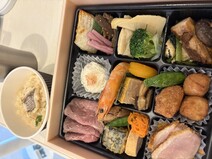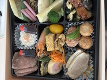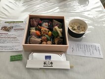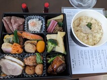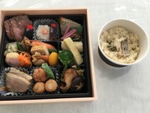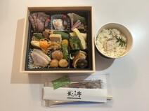 1セット(1人前)(ローストビーフ、若芽炒め煮、わさび、土佐醤油、和風蟹シュウマイ、ぽん酢、手造り合鴨あぶり焼き、焼き大根、焼葱、鴨ソースジュレ、揚げ里芋、揚げつくね/幸吉味噌、ししとう、有頭海老の旨煮、鶏の松風、帆立旨煮、くるみ胡麻和合、焼き車麩、花人参、筍、椎茸、薩摩芋、インゲン、鰈味噌焼き、ずいきの胡麻和合、蛸の桜煮、茶巾湯葉、南瓜の揚げ出し、オクラ、若鶏の山椒煮、しめじ香り炒め、小松菜油炒め)真鯛生姜御飯、蕗味噌