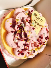 チーズケーキの上にはカーネーションの花びらのようなラズベリームースと彩りにピスタチオなどが散りばめられており、上品な華やかさがとても素敵でした。4号のケーキとなるとホールケーキとしては小さめのサイズですが、カーネーション部分のラズベリームース部分が高さがあるので比較的大きく感じました。大人でも6分の1くらいのサイズで満足できると思うので2-4人で分けるのには十分かなと思います。