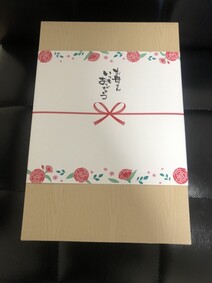 包装を開けると、中から奇麗な「母の日仕様の特別な」花柄の熨斗がかけられた化粧箱が現れました。熨斗には「お母さんいつもありがとう」と書かれています。母の日に感謝を伝えるのに最適ですね。化粧箱はフタミ式の箱でシンプルなベージュの蓋でした。