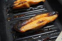 焼き方は同封されている資料を参考に、冷蔵庫で自然解凍させた後、切り身についている調味料をクッキングペーパーでふき取り、グリルプレートで弱火9分ほど加熱しました。