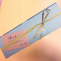 茶色の紙袋を開けると、グリーンの紐リボンが施されたグレーの細長いボックスにメッセージカードが添えられ、ショップさんの心遣いを感じます。ナチュラルな風合いのパッケージで過剰包装でないところにも好感が持て、可愛すぎずスタイリッシュなので大人の方や男性への贈り物にもぴったりです。冷蔵便で届くので、解凍不要ですぐ頂けるのもうれしいポイントですね。夕方到着し、冷蔵庫で冷やして夕飯のデザートに早速頂くことに。