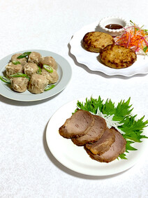 調理済みの焼売とハンバーグで三枚目の写真を撮りました♪
