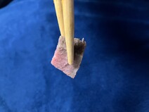 まずはなにも付けずにそのままひと切れ食べてみると、ジューシーながらさっぱりとしたローストビーフのコクと旨味に感動。臭みもなくて大変食べやすいです!