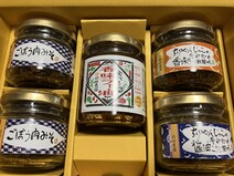 ごぼう肉味噌が2瓶、食べる香味ラー油、ちりめんじゃこの辛み炒め醤油こうじ風味、ちりめんじゃこの辛み炒め香味ラー油風味のまえた農園のベストな4種類5瓶の詰め合わせです。ごぼう肉味噌はメディアで取り上げられていて、ごぼうの香りが強く飽きない味噌味です。ご飯にもパンにも合いました!食べる香味ラー油は、ナッツの入った、辛すぎない、スタンダードなラー油です。ちりめんじゃこの辛み炒め醤油こうじ風味は、じゃこと生姜、砂糖と豆板醤、コチュジャンのバランスが良く、甘くてしょっぱいご飯のお供です。ちりめんじゃこの辛み炒め香味ラー油風味は、じゃこのカリカリとミックスナッツ入りで、食感が面白い、辛すぎなくてお酒とつまみの箸休めにオススメです