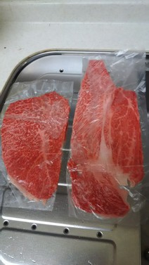 肩ロースとモモということです。赤身で綺麗な脂身が入っている方がモモ、そしてピンクでもう少し脂身が多い感じの方が肩ロースでしょう。それぞれ5枚ずつ入っているので、一枚80グラムほどと思われます。さすが高級すき焼き肉だけあって、一枚ずつ綺麗にフィルムに上下を挟まれて畳んであります。